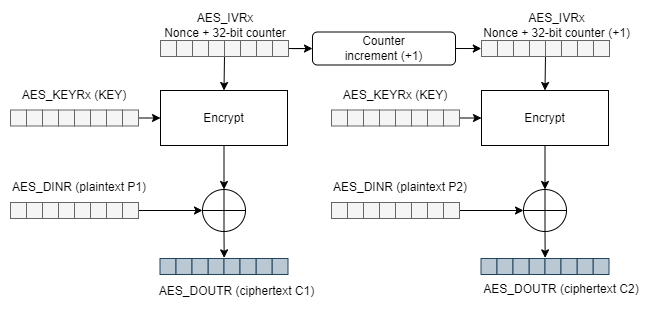 AES (Advanced Encryption Standard) is a symmetric key cryptographic algorithm, meaning the same key is used for both encryption and decryption of the message. The algorithm offers various modes such as CBC (Cipher Block Chaining), ECB (Electronic Codebook), CTR (Counter), and CCM (Counter with CBC-MAC), each with different characteristics. In this publication, we will focus on the CTR mode for several reasons: