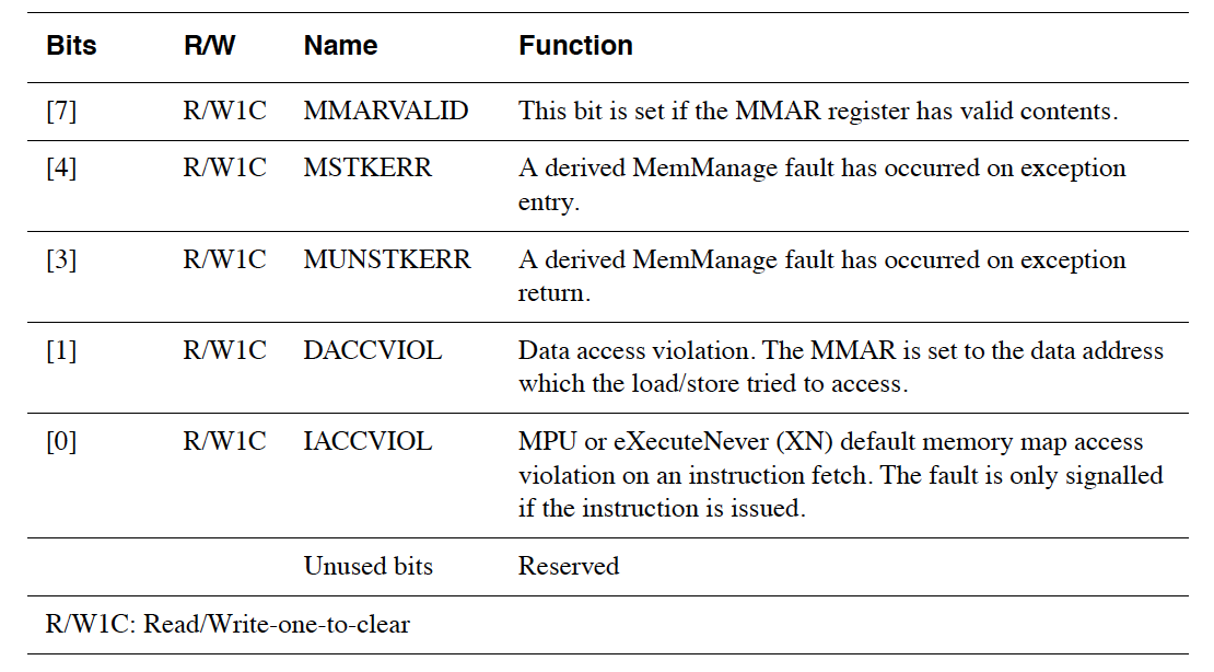 The second is the MemManage Fault Address Register (MMFAR) located at 0xE000ED34 which contains the address of the access which triggered the fault provided MMFSR.MMARVALID is set.